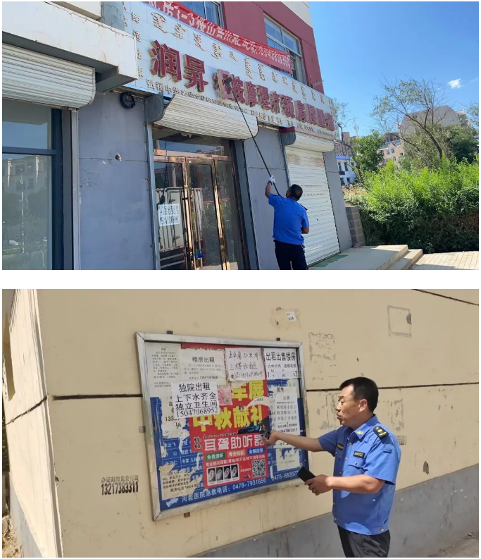 拆除破旧破损广告牌匾、清理建筑垃圾及平整场地、清理整顿流动商贩、清理居民巷道及物业小区堆放杂物、夜市巡查……,旗执法局集中整合执法力量,对辖区存在问题进行点对点清理。