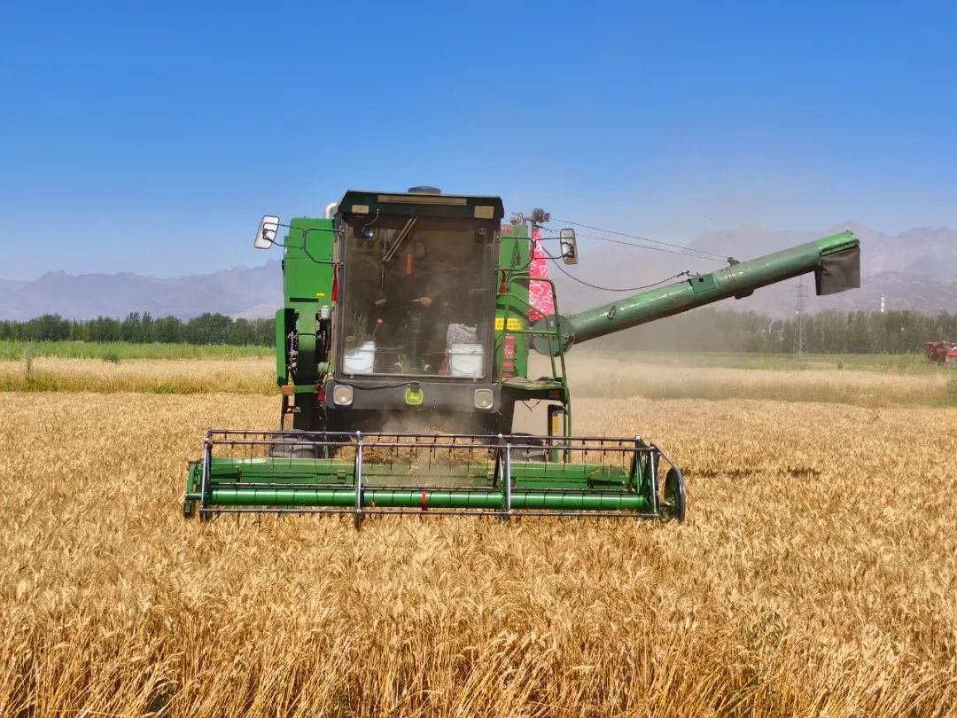 走进蒙海镇蒙海村2300亩小麦连片种植地,麦浪翻滚,金穗飘香,田野间丰收的喜悦随风荡漾,联合收割机来回“奔忙”,“吞下”沉甸甸的麦穗,“吐出”金灿灿的麦粒,田间地头一派繁忙景象。