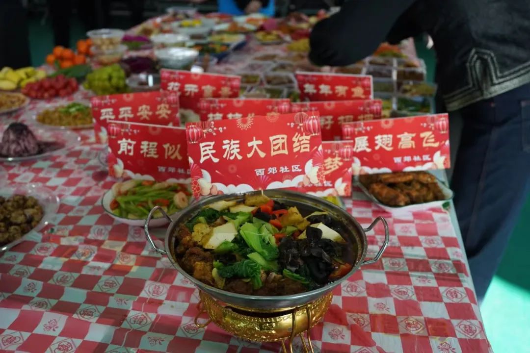 本次活动的另一大亮点是“百家宴”,居民纷纷端出自家精心准备的特色美食,摆满了长长的餐桌。色香味俱佳的“硬四盘”、独具风味的河套酿皮、精致可口的花馍馍等,一道道美食不仅是味蕾的享受,更是各民族文化的生动展示。大家围坐在一起,一边品尝美食,一边亲切交流,欢声笑语回荡在整个活动场地。