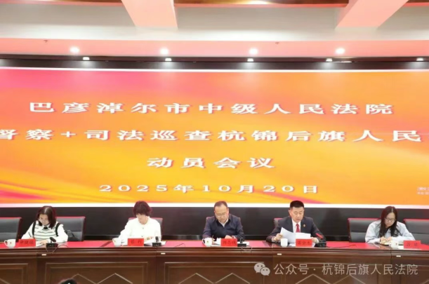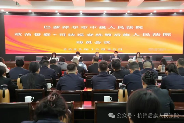 根据巴彦淖尔市中级人民法院党组统一部署,10月20日,巴彦淖尔市中级人民法院司法巡查组进驻杭锦后旗人民法院,开展政治督察+司法巡查工作,并召开动员会议。杭锦后旗人民法院党组书记、院长苗金龙主持会议,杭锦后旗人民法院领导班子成员、全体干警参加会议,司法巡查组全体成员出席会议。
