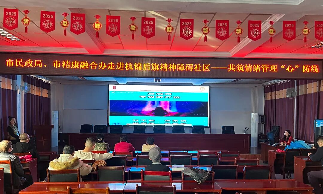 2025年11月5日,市民政局、市精康融合办联合杭锦后旗民政局,在杭锦后旗精神障碍社区开展“情绪管理知识专题讲座”,18名精神障碍人员参与培训,心理咨询师沈俊霞担任主讲。