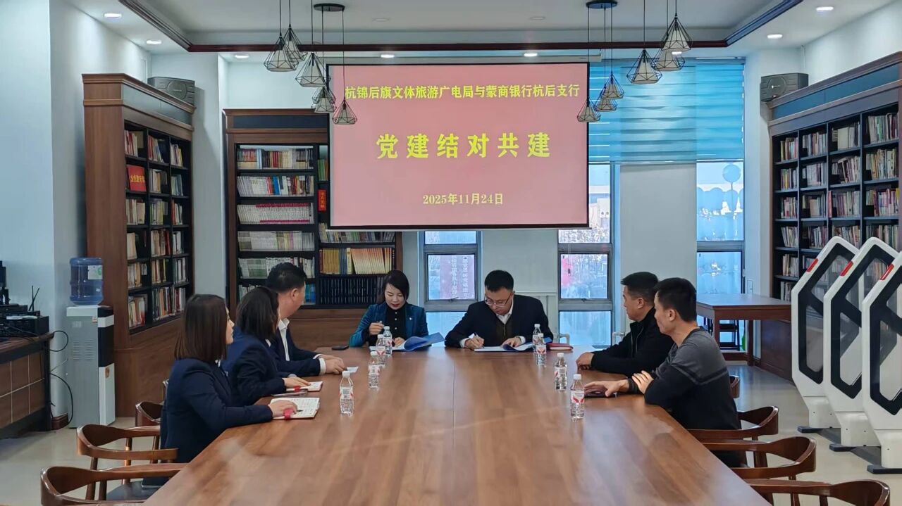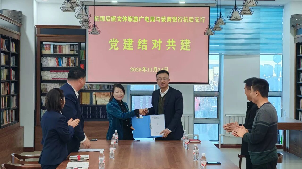 11月24日,杭锦后旗文体旅游广电局与蒙商银行杭后支行举行党建结对共建合作签约仪式,双方约定持续深化党建与业务融合,共同探索一条党建引领有力、金融服务温馨、文旅发展提速的协同共进新路子。