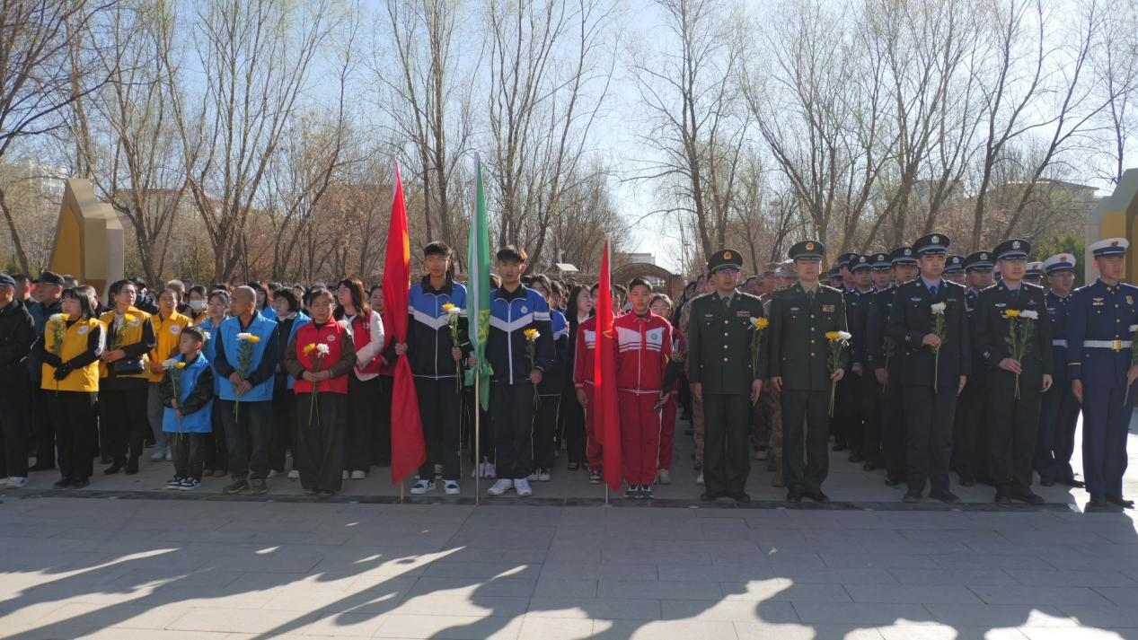 清明忆英烈,忠魂贯长空。为弘扬英烈精神,传承红色基因,营造尊崇英雄、关爱烈属的良好社会氛围,4月3日上午,杭锦后旗退役军人事务局联合旗委宣传部、社工部等10余个机关企事业单位在陕坝公园人民英雄纪念碑广场隆重举行“追寻·2026·清明祭英烈”活动,旗人武部官兵及民兵代表、公安干警、消防官兵、机关旗事业单位党员干部、志愿者代表、退役士兵代表、小学生团员代表等240余人参加祭扫活动。