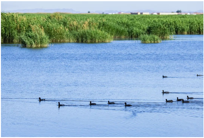 初秋的乌梁素海,天蓝水碧、湖面如镜,芦苇随风摇曳,凤头鸊鷉、赤麻鸭、白骨顶、绿头鸭等或游弋湖中、或栖于苇荡、或翱翔天空,一派自然和谐景象。