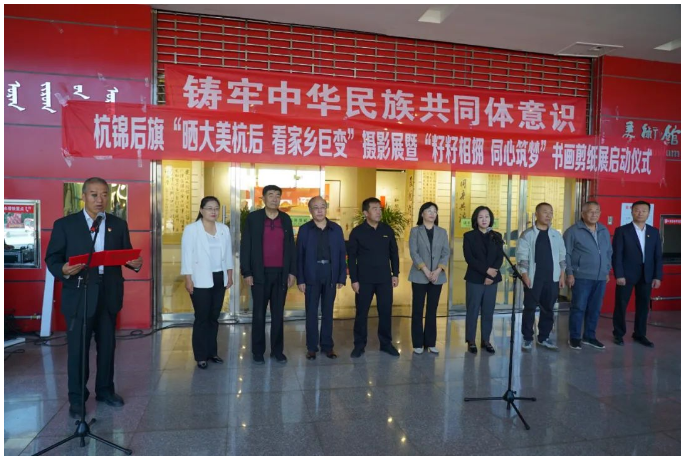 旗人大常委会副主任杨晓艳参加,政府副旗长乔玲君宣布书画剪纸摄影展开幕,旗政协副主席李明天致辞。