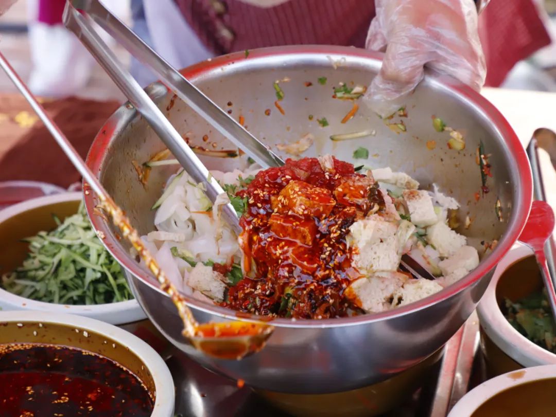 在古镇陕坝,没有什么是一碗酿皮、一个肉焙子解决不了的,如果有,那就再来一碗、再啃一口!爽口的黄瓜丝,以蒜水、醋、酱油、盐等调味,最后的灵魂绝对是那一勺香浓的辣椒油,一调一拌,再配上香酥美味的肉焙子,快乐就是这么简单……在“陕坝味道”音乐嘉年华系列活动上,独具“陕坝”特色的酿皮、肉焙子厨艺大比拼,一场盛大的“酿皮肉焙子盛宴”让无数食客“垂涎三尺”,将整个嘉年华活动推向了高潮。