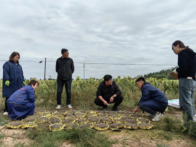杭锦后旗选区的地块是由杭锦后旗龙顺种养殖专业合作社种植,向日葵田测产工作采用实收测产的方式,随机选取3个代表性样点,每个样点实际面积41平方米,经对取样点花盘脱粒、清选、去杂、称重、计算,按标准含水量12%折算。该地块种植品种选用商品性好、高产抗病的同庆6号,采用向日葵扩行降密提质增效栽培技术,精细整地、深施向日葵专用底肥、北斗导航覆膜、春灌压盐碱,喷施精异丙甲草胺封闭苗前除草。6月初适时破膜盖沙人工点播,亩保苗1600株左右。结合中耕除草,机械测深施缓控释复合肥25公斤,全生育期浇水1次。在防治病虫害过程中以预防为主,及时防治向日葵螟、蓟马、黄萎病等病虫害。同时为了提升品质,合作社还配套增施有机肥、生物菌肥、喷施植物生长调节剂和蜜蜂授粉等技术措施,向日葵成熟后,采用插盘晾晒,及时收获。