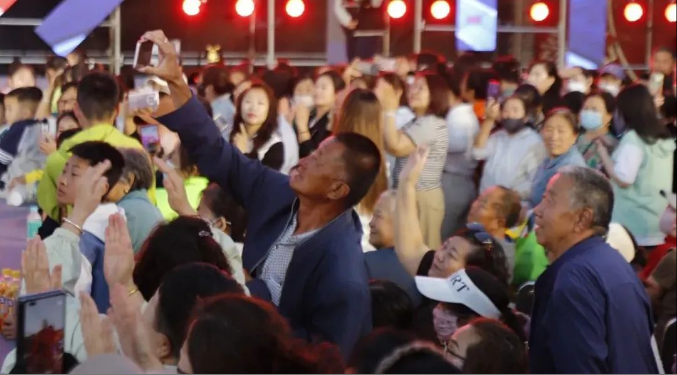 陕坝镇彩虹群众文化艺术团的20多位表演者以《威风锣鼓》敲响活动序幕,挥槌击钹间鼓点如万马奔腾,瞬间点燃现场氛围。与此同时,网红直播带货区早已被观众层层围住,网红达人十三姨举着镜头走进“陕坝味道”美食摊位,镜头前的推荐让摊位即刻排起长队。随后,十三姨团队带来《苹果香》《仙儿》等网络热歌,观众随着节奏挥舞手臂,欢呼声与掌声如浪潮般迭起,周边摊位的食材香气仿佛也随着鼓点跃动,将民俗展演的热烈与网红直播的潮流感,尽数融入夏日晚风之中。