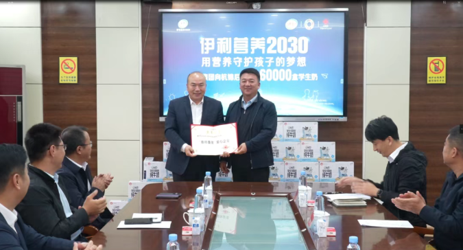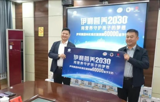 仪式现场,伊利集团向杭锦后旗教育局捐赠总价值15万元的2500箱学生奶,并进行授牌,以优质营养为当地学子的健康成长筑牢根基。