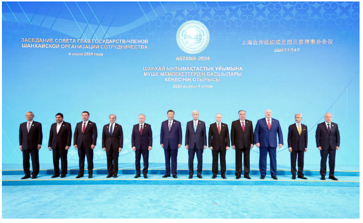 当地时间7月4日上午,国家主席习近平在阿斯塔纳独立宫出席上海合作组织成员国元首理事会第二十四次会议。这是习近平同上海合作组织成员国领导人集体合影。新华社记者 鞠鹏 摄