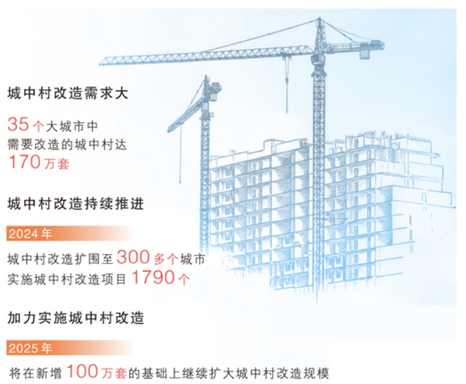 2024年,城中村改造扩围至300多个城市,实施城中村改造项目1790个。2025年,为持续用力推动房地产市场止跌回稳,住房城乡建设部将加力实施城中村和危旧房改造,推进货币化安置,计划在新增100万套城中村改造和危旧房改造的基础上继续扩大改造规模。