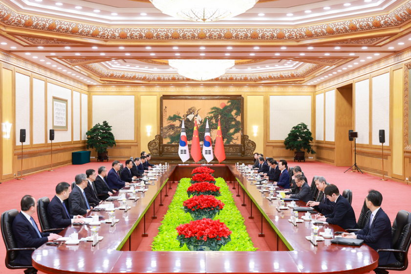 习近平指出,当前世界百年变局加速演进,国际形势更加变乱交织。中韩在维护地区和平、促进全球发展方面肩负重要责任,有广泛利益交集,应当坚定站在历史正确一边,作出正确战略选择。80多年前,中韩两国付出巨大民族牺牲,赢得抗击日本军国主义的胜利。今天更应携手捍卫二战胜利成果,守护东北亚和平稳定。作为经济全球化的受益者,中韩要共同反对保护主义,践行真正的多边主义,为推进平等有序的世界多极化、普惠包容的经济全球化作出贡献。
