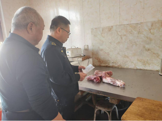 此次检查以生鲜猪肉、牛羊肉及冷冻肉制品为重点,对辖区内7家肉制品经营商户逐户查验动物检疫合格证明、肉品品质检验合格证等关键票据,严防“票货分离”“过期票据复用”等问题。同时,同步检查经营户进货台账记录是否完整,索证索票制度是否落实到位,确保肉制品来源可溯、去向可查。