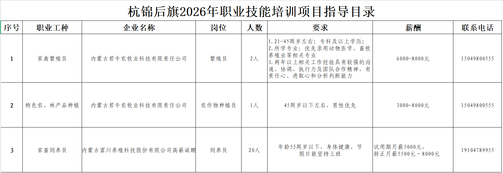 现将杭锦后旗2026年“技能照亮前程”职业技能培训项目指导目录如下,欢迎各职业技能培训机构积极与用工单位对接,开展订单式、定岗式培训。有就业技能培训需求的群众,可自行选择培训机构参加培训。