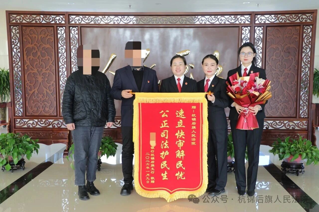 近日,杭锦后旗人民法院收到了来自辖区某银行专程送来的一面写有“速立快审解民忧 公正司法护民生”的锦旗,以此表达对杭锦后旗人民法院在高效化解金融纠纷、优化法治化营商环境方面所做工作的诚挚感谢。