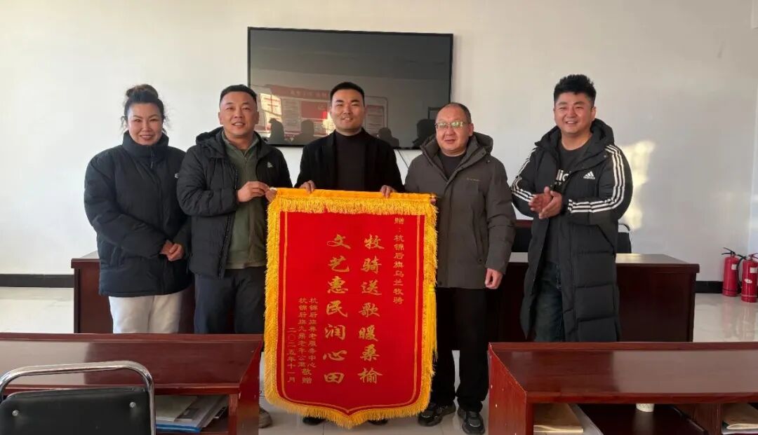 12月2日,九鼎老年公寓的负责人将一面写有“牧骑送歌暖桑榆 文艺惠民润心田”的锦旗,送到杭锦后旗乌兰牧骑队员手中,对乌兰牧骑开展文艺志愿服务“送欢乐 送文明”下基层文艺演出表示感谢。