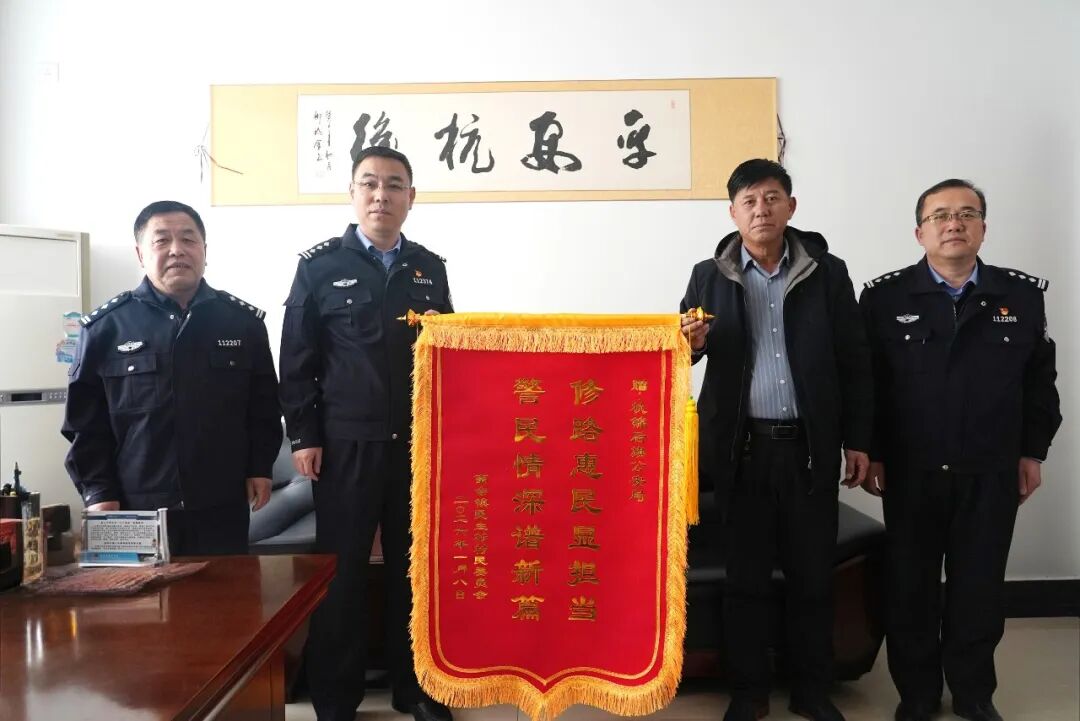 1月13日,杭锦后旗蛮会镇民生村村委会代表将一面写有“修路惠民显担当警民情深谱新篇”的锦旗送至杭锦后旗公安局,感谢公安机关帮助村里修建期盼已久的沥青道路。这是杭锦后旗公安局助力巩固拓展脱贫攻坚成果同乡村振兴有效衔接的具体体现,也是扎实推进驻村帮扶工作的一项基本举措。