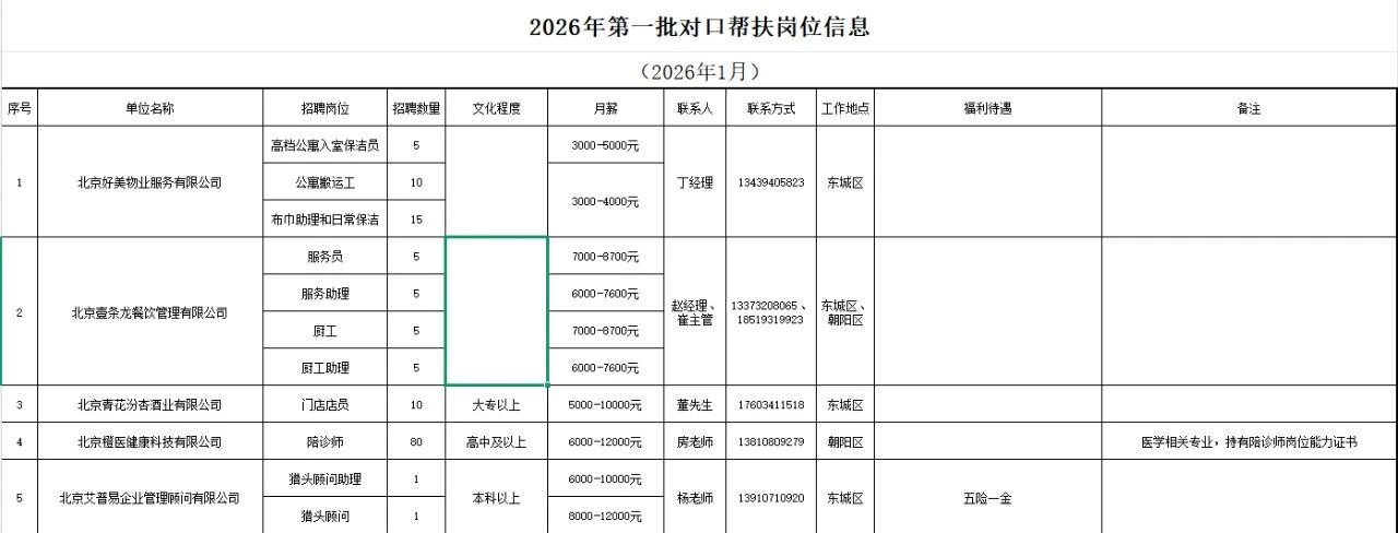 2026年第一批对口帮扶岗位信息