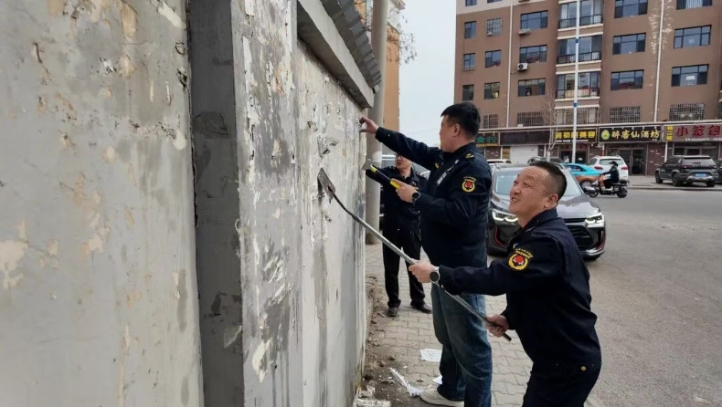 工作人员手持工具逐片排查、逐点清理,严格按照“全面覆盖、不留死角”的原则,对小区楼道、沿街宣传栏、电线杆、建筑外墙等重点区域开展集中整治,逐处清理乱贴乱画的小广告,不放过一处死角、不漏掉一个盲点。杭锦后旗城市管理综合行政执法局工作人员李乾说:“很多小广告用强力胶粘贴,清理起来特别费时费力,往往张贴只需要几秒钟,而需要用到铲刀、除胶剂等工具反复处理,清理一处就要用上几分钟。”