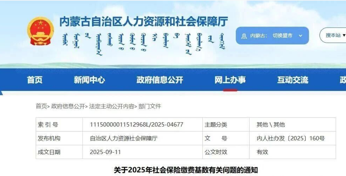 根据内蒙古自治区人力资源和社会保障厅、内蒙古自治区财政厅、国家税务总局内蒙古自治区税务局《关于2025年社会保险缴费基数有关问题的通知》(内人社办发〔2025〕160号)文件精神,为切实保障参保职工的切身利益,现将调整2025年社会保险缴费基数有关事宜通知如下: