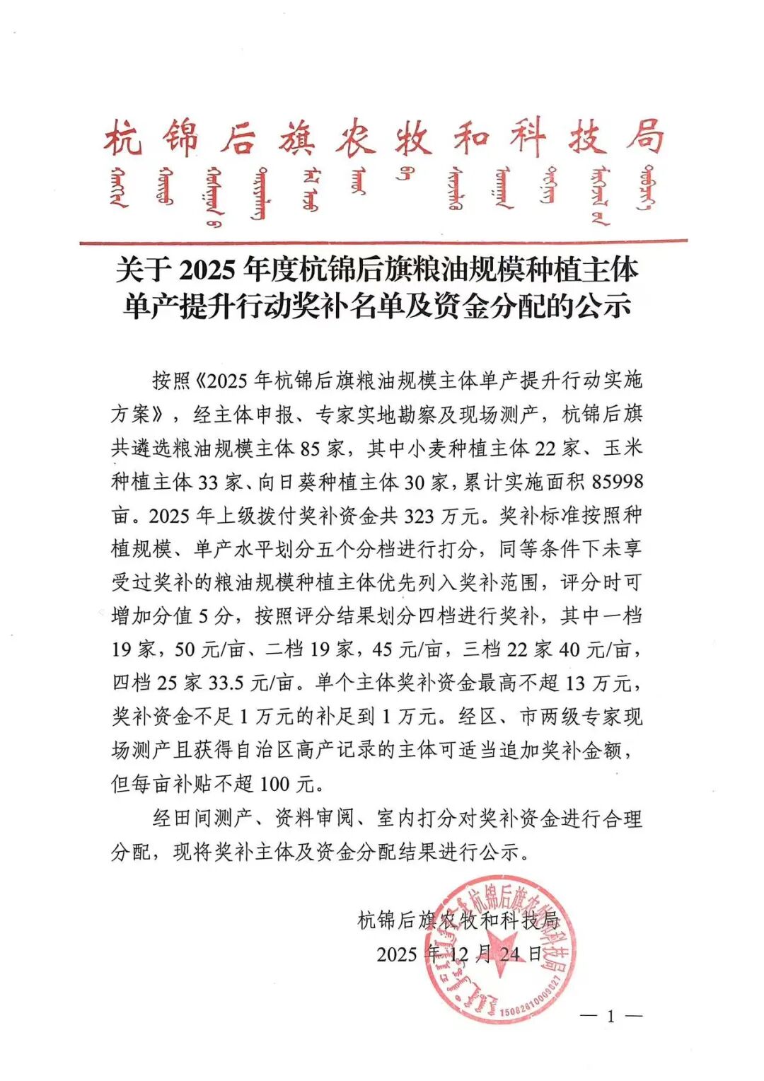 关于2025年度杭锦后旗粮油规模种植主体单产提升行动奖补名单及资金分配的公示