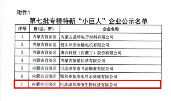 近日,经工业和信息化部严格评审,杭锦后旗巴彦淖尔华恒生物科技有限公司凭借其在食品及饲料添加剂制造领域的突出创新能力和市场领先地位,成功被认定为国家级专精特新“小巨人”企业!