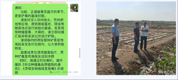 由镇综治中心牵头,联合二道桥派出所,组织各村两委、网格员、护林员等深入田间地头、废弃宅院、闲置厂房、蔬菜大棚、林间空地等潜在非法种植区域,对村民房前屋后、院落棚圈等隐蔽地点,展开了全方位、无死角的地毯式踏查行动。同时,积极向村民们宣传禁种铲毒法律法规,普及罂粟、大麻等毒品原植物的识别知识,讲清非法种植的法律后果,动员广大群众自觉抵制毒品原植物种植,并鼓励大家积极检举揭发非法种植行为。广大村民对此次行动给予了充分的理解和支持,营造了全民参与禁种铲毒的浓厚氛围。