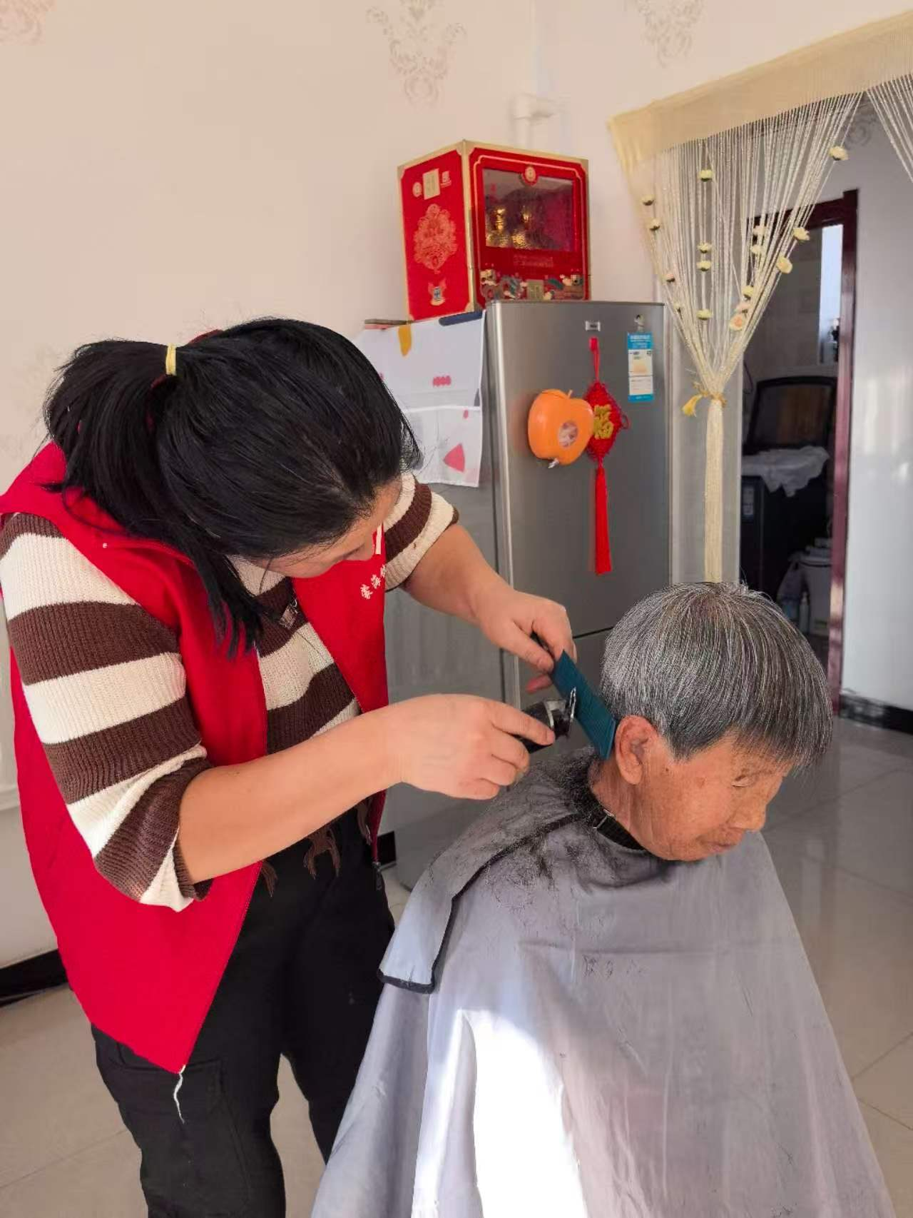 在打扫过程中,志愿者们手持清洁工具,分工明确,有的发挥特长带理发工具和清洁工具,帮老人细心地围上围布,一边亲切地与老人聊着家常,一边娴熟地修剪头发;有的用拖把将地板擦洗得光可鉴人;有的用抹布擦去玻璃浮尘,让雾蒙蒙的玻璃变得晶莹透亮,在大家的共同努力下,将杂乱的居所打扫得干净整洁、井然有序,为他们营造了舒适宜居的生活环境。