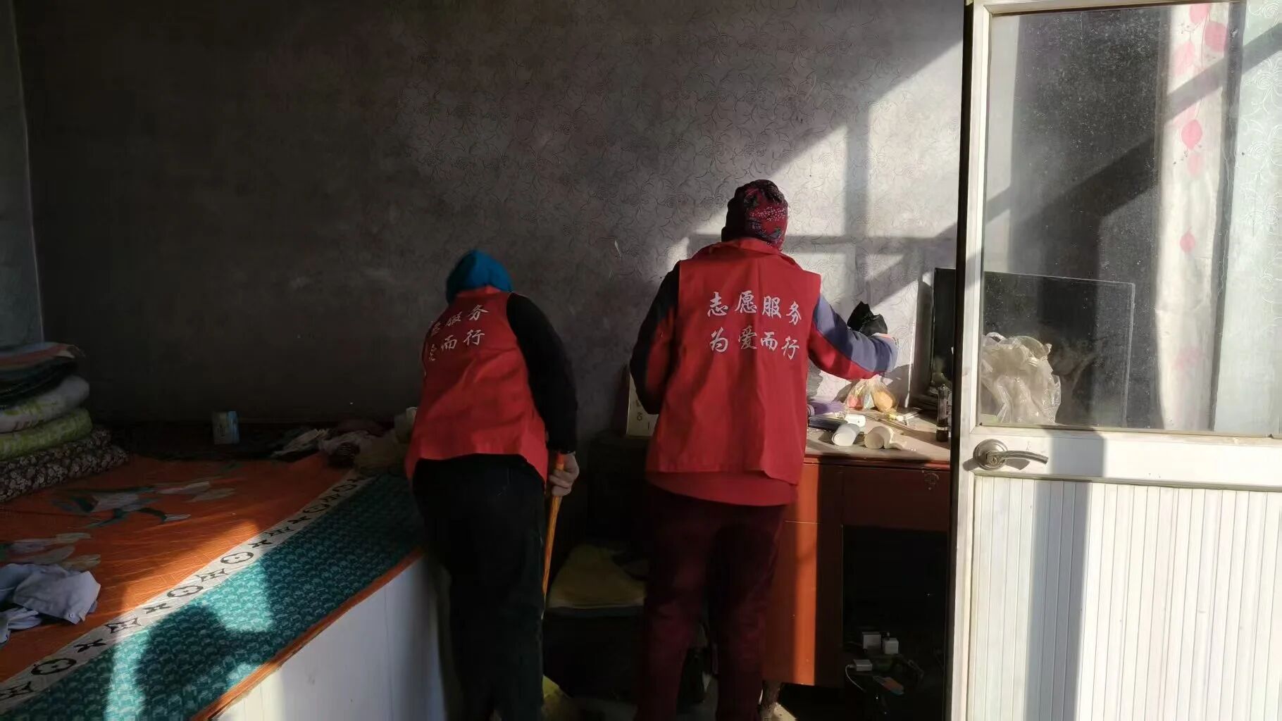 改变不仅发生在环境里。每次服务结束,志愿者总会多留半小时,陪陶先生夫妇聊家常、教些简单家务。渐渐地,村民们发现变化:原本堆满杂物的窗台变得透亮,院角的杂草被清理成小花圃,就连总蜷缩在角落的陶先生也开始主动晒被子。这种“润物无声”的影响,让志愿服务超越了简单的卫生清扫,成为连接心灵的纽带。