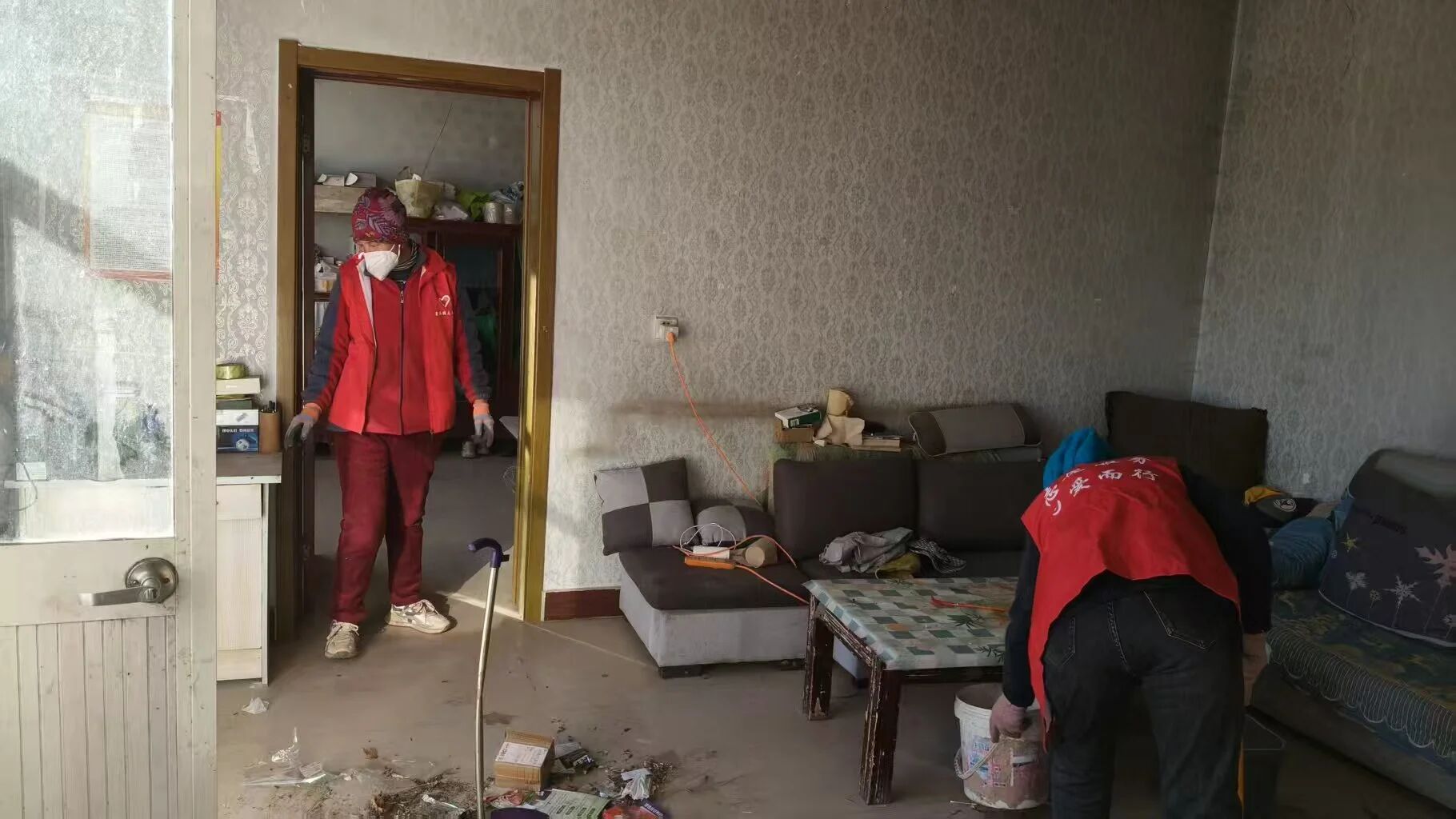 陶先生家是村里的脱贫典型,但因夫妻二人存在智力障碍,日常家务和卫生维护存在困难。屋内杂物堆积、院外杂草丛生,甚至存在电线私拉等安全隐患。李秀兰带领志愿者们提前走访摸排,制定了“安全优先、分类帮扶”的方案:先切断电源、移除危险物品,再清理卫生死角,最后整理生活物资。他们分工协作、热火朝天:扫帚挥舞间,地面尘埃尽数褪去;拖把擦拭处,瓷砖重现洁净光泽。一人细心规整桌椅,让空间焕发整洁活力;两人搭手擦拭玻璃,清水与抹布交替,将污渍彻底清除。院落中,杂物被逐一归置,角落焕新颜。他们弯腰劳作的身影穿梭其间,汗水滴落处,用实干诠释志愿精神的温度。陶先生虽不善言辞,却反复用手指着志愿者身上的红马甲,脸上绽放出笑容。