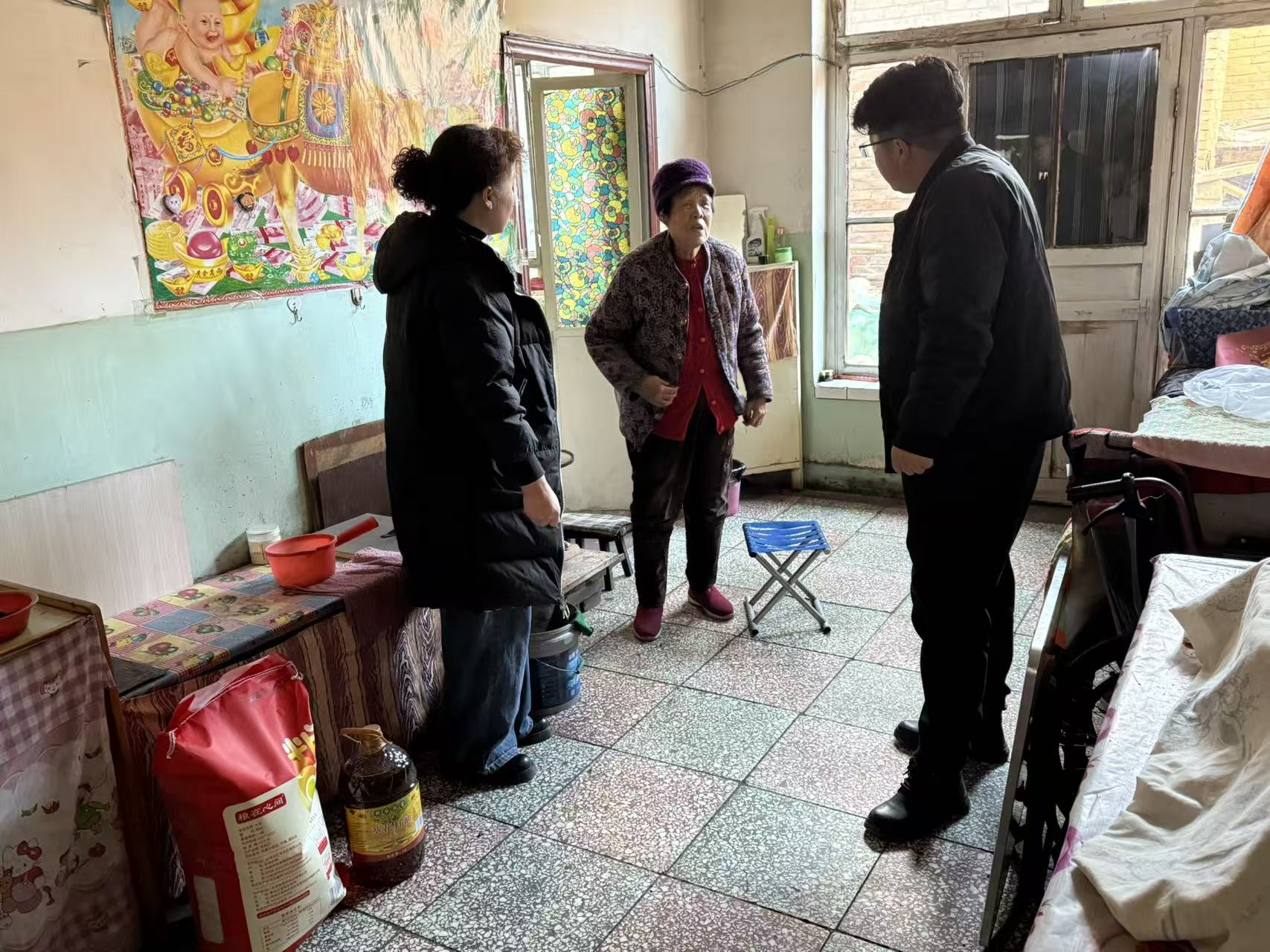 活动当天,村“两委”成员重点走访慰问了村里的孤寡老人、残障人士等特殊群体,为他们送去了米面油等物资。每到一户,工作人员都与群众面对面交流、心贴心沟通。在独居老人家中,大家主动挽起袖子当起“勤务员”,细致地擦窗户、扫庭院、整理杂物,不多时就将原本凌乱的房间收拾得窗明几净;随后,工作人员还为老人测量血压,耐心询问身体状况和生活需求。