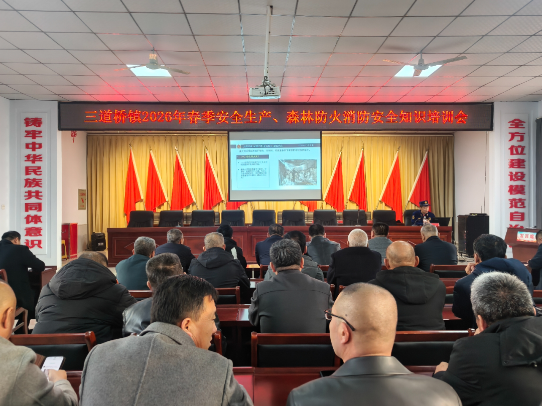 为切实筑牢春季安全生产防线,有效防范森林火灾及各类安全事故,3月2日,三道桥镇组织召开2026年春季安全生产、森林防火消防安全知识培训会。会议特邀旗消防救援大队指战员主讲,镇全体领导干部、各村(社区)“两委”班子成员及部分社长代表参加会议。