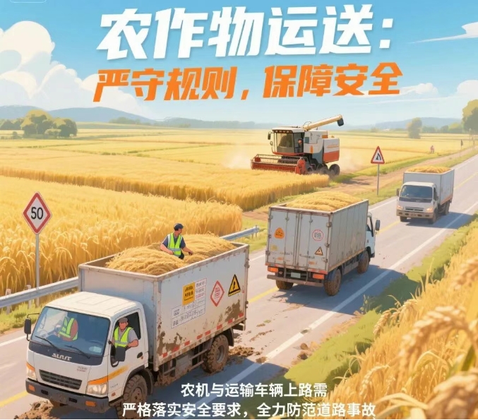 秋收时,咱们常开着农机、三轮车拉农作物、赶路,路上车多人杂,必须守好规则,避免意外: