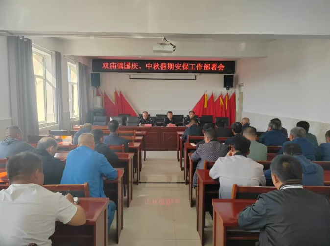 双节将至,为切实保障辖区群众度过平安祥和的假期,9月30日,双庙镇召开国庆、中秋假期安保工作部署会,全面分析镇域安全形势,细化落实防范措施。会议由镇党委副书记、政法委员李自强主持,各村支部书记、副书记参加会议。