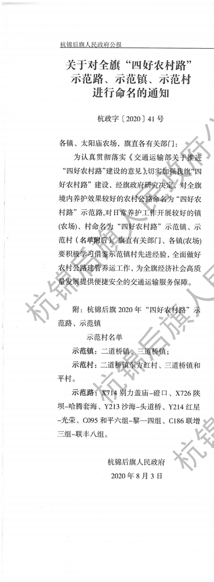 关于对全旗“四号农村路”师范路、示范镇、示范村进行命名的通知