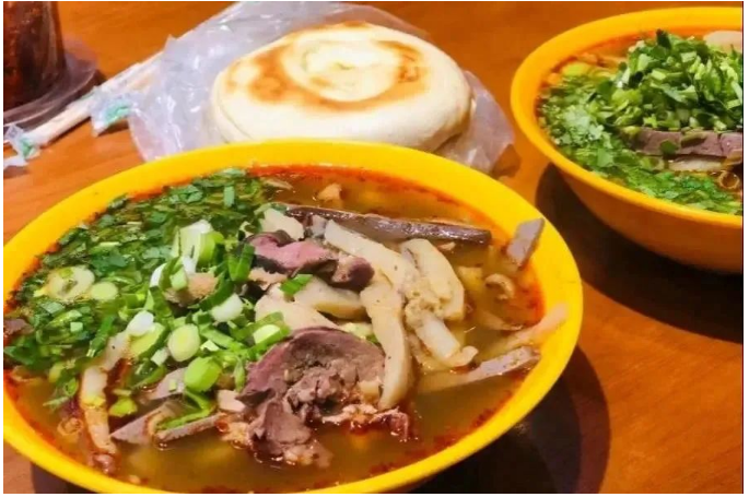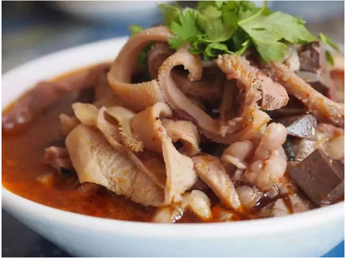 羊杂碎是大西北地区常见的传统风味汤类小吃。在西北地区,牛羊成群,品质优良,每当人们宰杀羊后,剩余的“羊下水”,如羊的血、肠、心、肝、肚、头、肺等,收拾干净,最后放入有各种调料的锅内分别煮熟。羊杂碎富含多种维生素、蛋白质等,是老少皆宜的美食特色小吃。