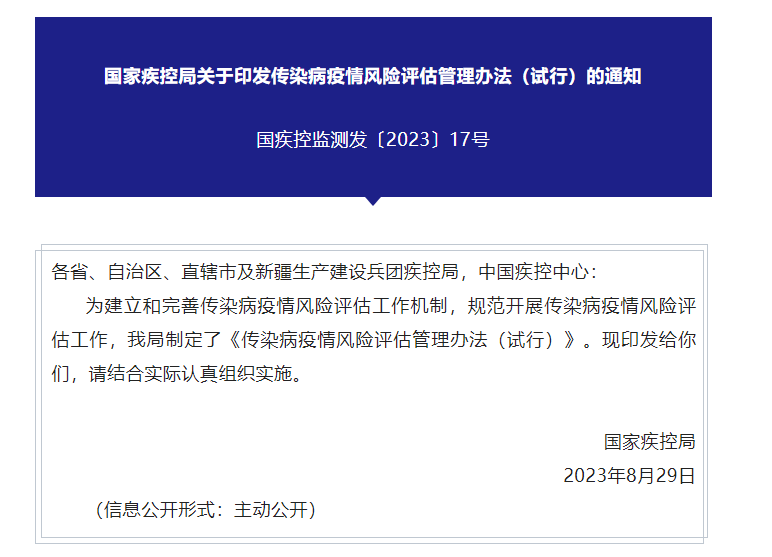风险评估是增强传染病疫情早期监测预警能力,防范和化解公共卫生风险的重要手段。为提高传染病疫情风险管理水平,规范和指导风险评估工作,国家疾控局监测预警司组织中国疾控中心,以及中华预防医学会、清华大学、北京大学、北京协和医学院、国家卫生健康委卫生发展中心和部分省份专家研究制定了《传染病疫情风险评估管理办法(试行)》(以下称《办法》)。